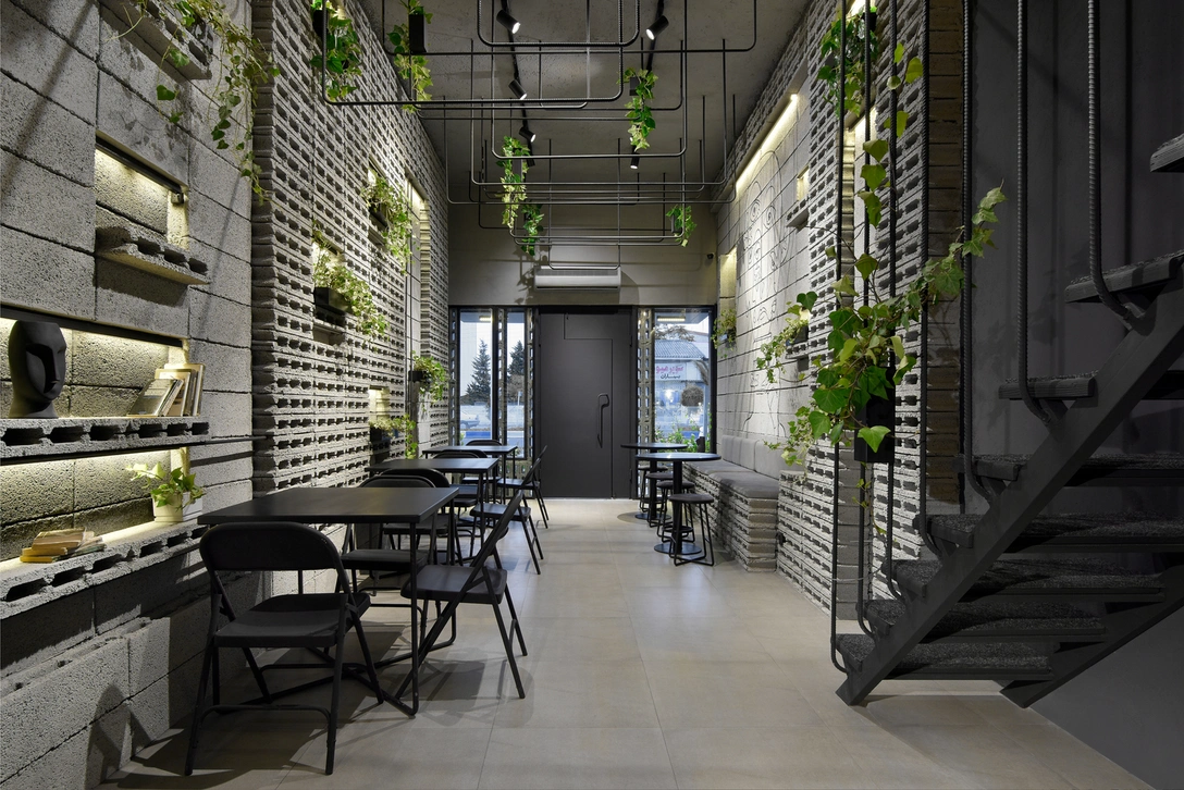 Брутальность бетона разбавляют комнатные растения. Архитектор выбрала плющ, потому что он неприхотлив и способен сильно разрастаться, заполняя собой максимум пространства. Со временем все металлические арки на потолке, перила и стена, ограждающая второй этаж, покроются зеленью. Этот «аксессуар» сыграл настолько важную роль, что в итоге кофейню назвали его честь.