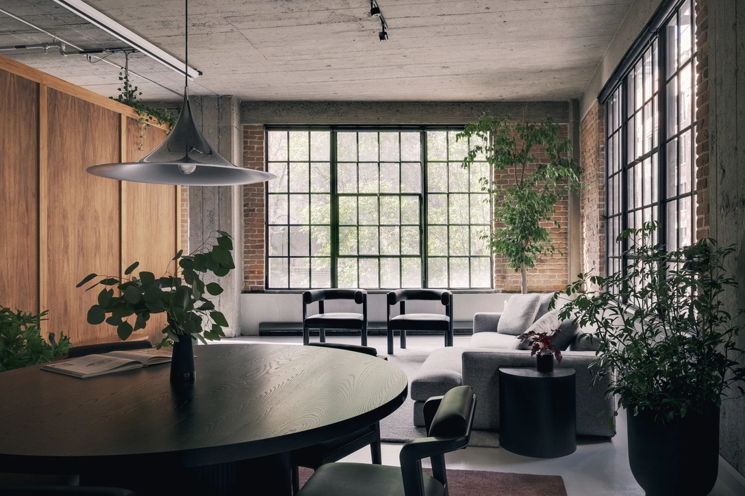 Палитра материалов напоминает о промышленном прошлом здания. Ореховая фанера, из которой сделаны конструкции для спален, сочетается с оригинальной кирпичной кладкой и бетонными потолками. Зону кухни определяет барная стойка с гранитной столешницей и табуреты Form от Normann Copenhagen. Обеденная зона оборудована дубовым столом, разработанным Future Simple Studio. В соседней гостиной — бледно-серый диван от Element de Base соседствует с трубчатыми креслами от Atelier Vaste. Ванная комната оформлена фарфоровой и керамической плиткой из Италии и Монреаля.