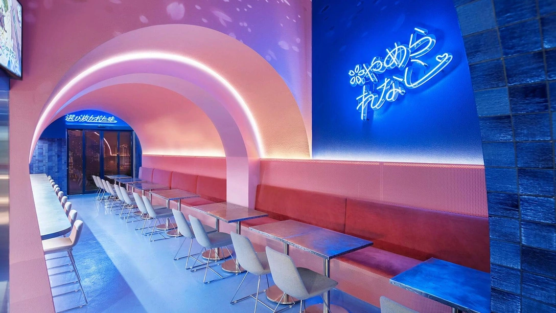 Дизайнеры оставили изначальную вытянутую планировку и спроектировали настоящий туннель. На нежно-розовые стены проецируется изображение летящих розовых лепестков для имитации традиционного ритуала ханами. Контрастные кобальтово-синие плитки придают пространству текстуру и глубину. Кухню отгораживают от обеденной зоны перфорированные панели, через которые просачиваются кулинарные ароматы. www.spandesign.com.au