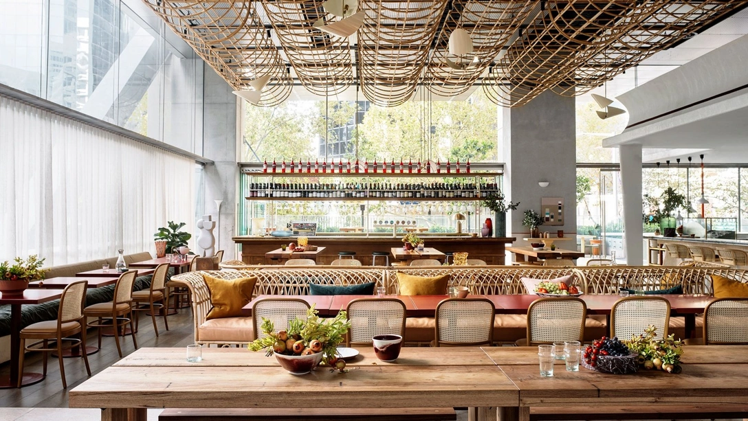Несмотря на строгую архитектуру здания, пространство кажется теплым и гостеприимным. Все благодаря землистой цветовой палитре и натуральным материалам. Огромная конструкция из ротанга, напоминающая облака, ловко скрывает металлические панели на потолке, в то время как льняные шторы пшеничного оттенка очерчивают периметр, закрывая панорамные окна. Кожаная обивка абрикосового и оливкового цветов, а также красные столешницы в сочетании с деталями из латуни и мрамора дополняют праздничную обстановку ресторана, которая приглашает выпить пару «аперолей» за воскресным обедом, разделить пиццу на первом свидании или устроить большой семейный праздник.