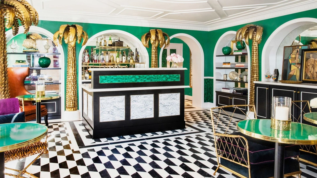 Внутри отеля все иначе: на смену сдержанной Англии приходит яркий Голливуд. Мраморные полы с геометрическим узором, изумрудно-зеленые стены и позолоченные пальмы-пилястры подчеркивают стремление Булларда вернутся к золотому веку американских 1930-1940-х. Бархатные банкетки здесь сочетаются с латунными акцентами, яркими декоративными подушками и объектами современного искусства.