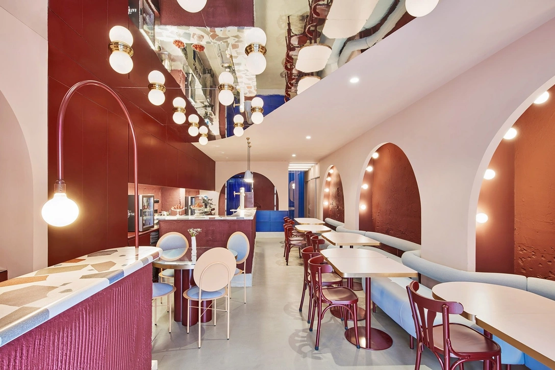 Пространство ресторана разделено на две части. Для передней зоны, La Escena («сцена»), дизайнеры подобрали редкое, но удачное сочетание цветов — синего и бордового. Три арки с углублениями, в которых расположены кожаные кушетки, отдаленно напоминают ложу. В другой части, Behind the Scenes («закулисье»), есть подсобное пространство, или гримерная в театральной лексике, где располагается кухня и уборная, и еще одна обеденная зона, оформленная в фирменных синих и персиковых тонах. www.bodegoncabinet.com