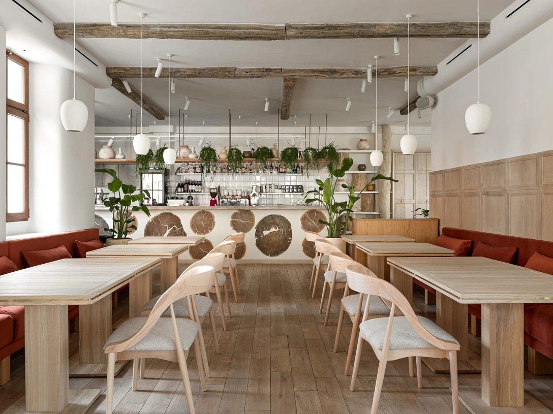 При входе гостей встречает отделанная плиткой молочного оттенка стойка кухни и бара, у которой гости могут наблюдать за работой поваров. Основное пространство первого этажа занимают круглые столы для шумных компаний, а у окон расположились французские диваны. На втором этаже сохранились два действующих камина, один из которых команда реставрировала специально для проекта.