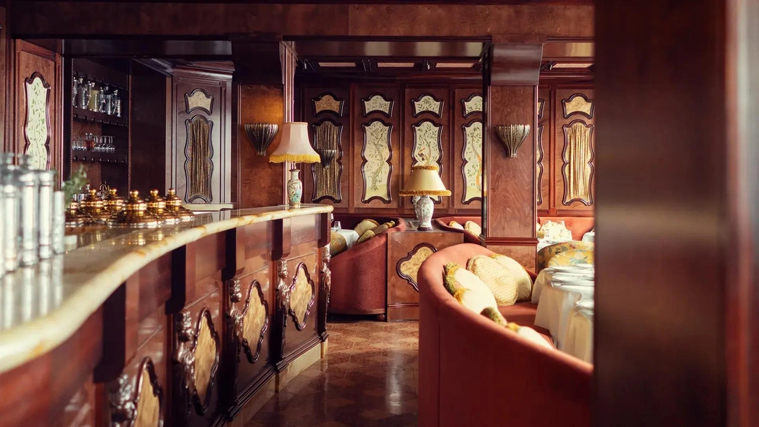 Центр пространства занимает изогнутая барная стойка. Ее основание сделано из капа, а столешница — из сиенского мрамора. Всю мебель дизайнеры разработали специально для проекта, начиная от бархатных банкеток и заканчивая шкафом, вдохновленным обстановкой флорентийских аптек. Облик интерьера завершили старинные лампы с тканевыми абажурами.