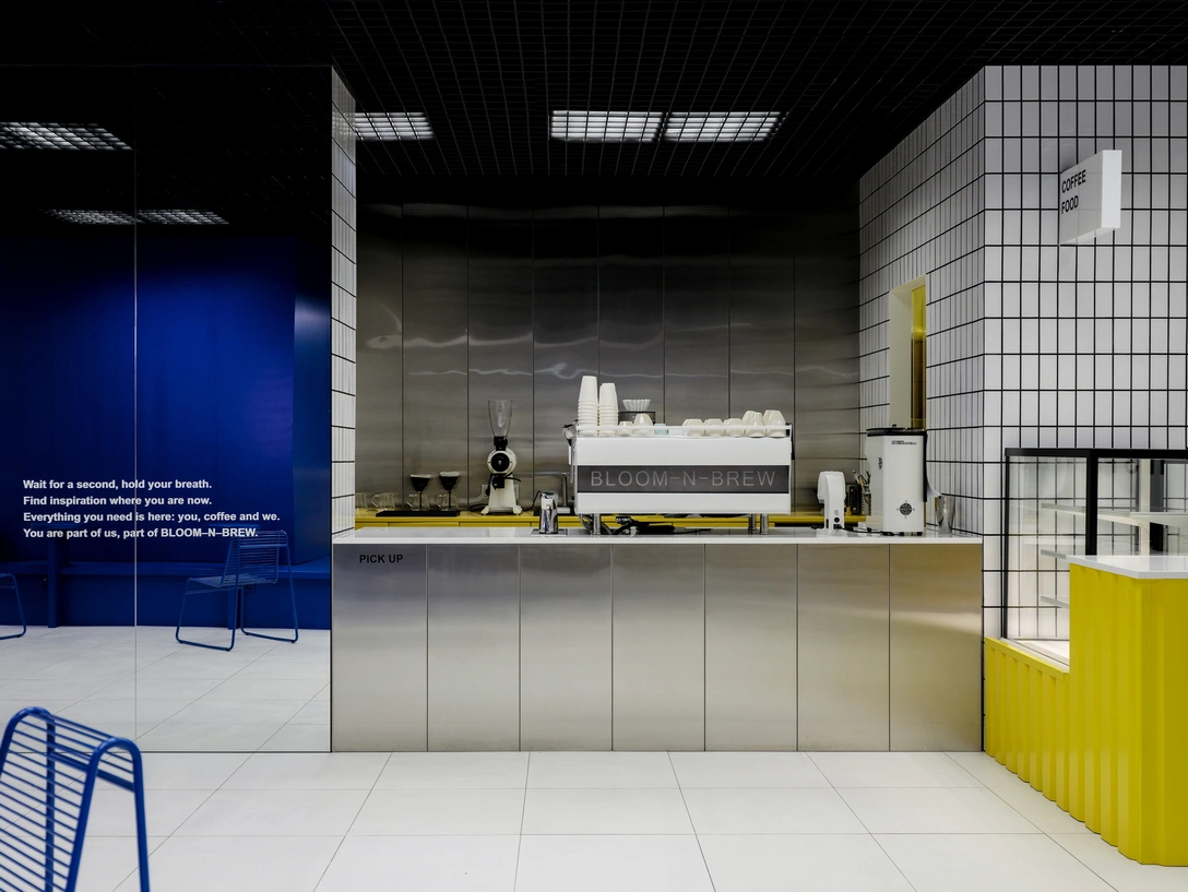 Особое внимание дизайнеры уделили стойкам: кофейная выполнена из нержавейки, желтая бэк-стойка и витрина с кассовой зоной — из профнастила, напоминающего оформление советских балконов. «Мы старались, чтобы каждая из них выглядела самодостаточно, как полноценный объект-интерьера», — говорит дизайнер.