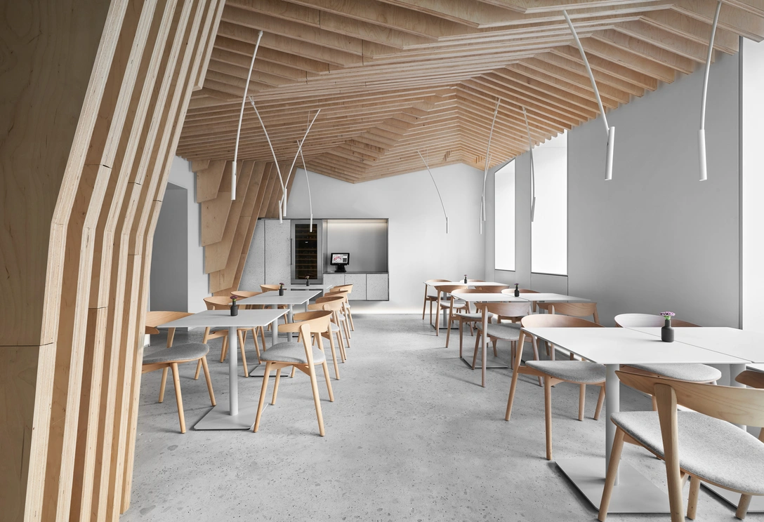 «Одним из преимуществ помещения была высота его потолков, и мы решили использовать ее в качестве визуального магнита всего пространства. Так возникла массивная деревянная структура под потолком. Она состоит из сорока деревянных деталей и напоминает огромную полигональную морскую волну, таким образом посетители ресторана оказываются метафорически под водой. В этом прочитывается отсылка к названию заведения — Under The Sea».