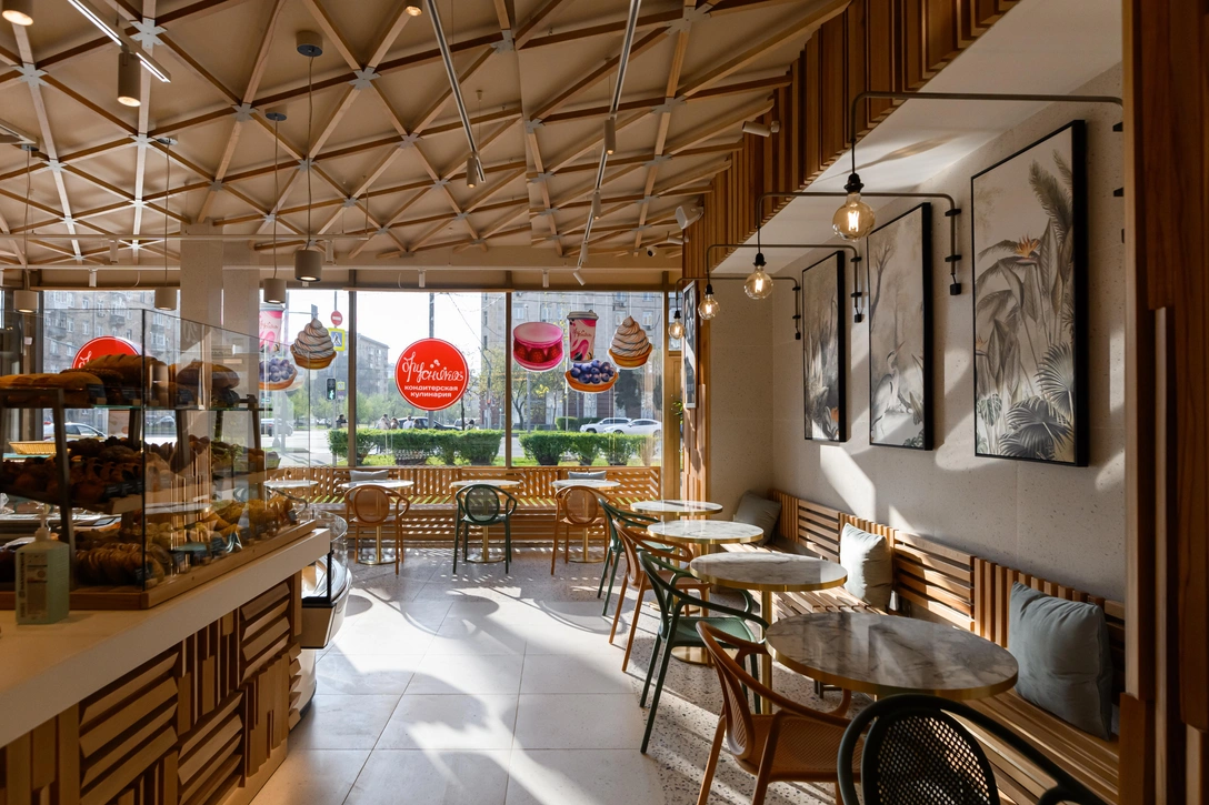 Все заведения «Брусники» отличает стильный современный интерьер, в который хотелось бы вернуться снова и снова. Не стал исключением и новый проект, открывшийся в старом районе Хамовники на Комсомольском проспекте. В оформлении использовано много натурального дерева, которое создает уютную, гостеприимную атмосферу. Это и реечный потолок из теплого бука, и деревянная отделка прилавка, и удобные лавочки по периметру зала, которые дополняют стулья итальянской марки Pedrali.