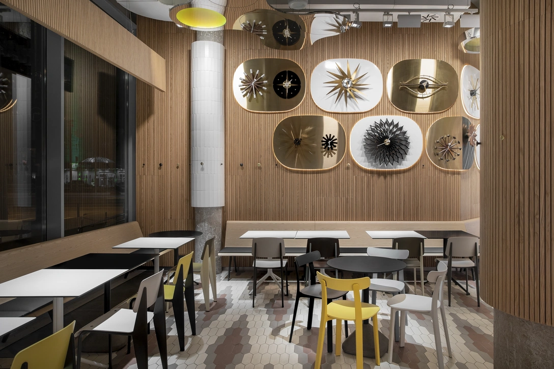 Сеть «Кулинарная лавка Братьев Караваевых» пополнилась новым заведением в Сокольниках, которое стало 42-ым по счету в семействе и четвертым в портфолио архитектора Евгения Щетинкина. Новая лавка располагается в двух шагах от метро и парка в ТЦ «Сокольники», что выделяет ее на фоне остальных кафе «Братья Караваевы». Большинство из них стоит на тихих московских улочках, вдали от столичной суеты и шума. Новая же точка находится прямо в центре городской жизни, посреди оживленного пешеходного трафика, который станет еще активней после ввода в эксплуатацию строящейся станции Большой кольцевой линии метро. Учитывая этот контекст, архитектор решил максимально уравновесить пространство посредством дизайна, оградить его от столичной суматохи и создать внутри теплую, обволакивающую атмосферу.