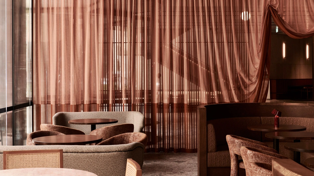 Интерьер бара Dame выполнен в розово-брусничных оттенках. Переливающиеся в свете шторы из воздушной ткани, отделяющие бар от других пространств комплекса, мраморные столики и изогнутая барная стойка, вторящие ей кресла, скамьи по периметру бара — все это создает ощущение легкости и изысканности, которое подчеркивается стульями с плетенными спинками и столиками из темного ореха. Примечательно, что дизайнеры Bergman & Co не только придумали вдохновивший их женский образ, но и воплотили его в жизнь. Художница из Мельбурна Стейси Риз (Stacey Rees) нарисовала «женщину 1980-х», и теперь ее портрет висит за барной стойкой.