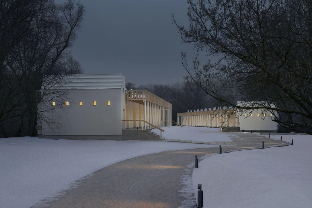 Поэтому в одноэтажной галерейной гостинице можно увидеть и белизну русских церквей, и принцип таунхауса, нетипичный для России. «Башенки» с зубцами и окошками-бойницами напоминают и русские печи, и голландские дома. Открытые галереи, в которые выходят номера, это и галереи в русских монастырях (чаще всего их в конце концов закрывали, потому что погода не располагает), но также и отсылка к классической архитектуре. Короче говоря, тем, кто поселится в гостиничном комплексе этой зимой, будет о чем поразмышлять.