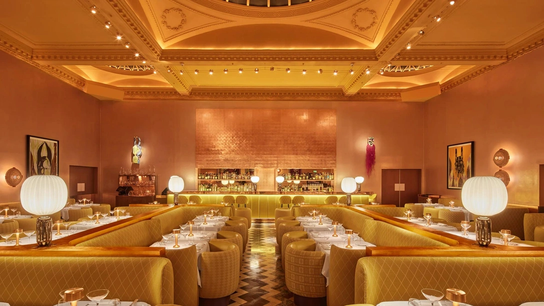 Интерьер заведения выполнен в насыщенных золотистых тонах. Богато украшенный кессонный потолок и стены персикового цвета служат идеальным фоном для мягкой мебели в обивке цвета охры по дизайну Индии Мадави, а пол с рисунком зиг-заг в коричневых оттенках отсылает к африканским орнаментам. Все это дополняют работы Йинки Шонибаре на стенах — десять коллажных полотен с африканскими масками и тотемами, которые в точности повторяют маски из коллекции Пабло Пикассо (таким образом художница решила высказаться против культурой апроприации).