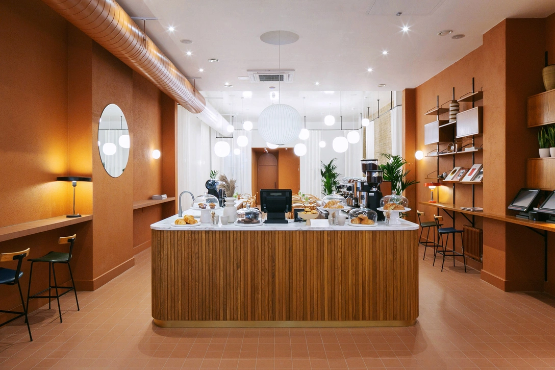 Оранжевая краска нанесена на стены средней части кафе, где располагается зона кондитерской. Основание барной стойки облицовано дубовыми планками, а столешница изготовлена из белого мрамора Calacatta. Прямо над головой висит лампа Bubble, разработанная американским дизайнером Джорджем Нельсоном (George Nelson). Пол облицован терракотовой плиткой, которая также украшает арочные панели в ванных комната.