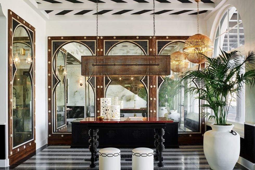 Для интерьеров номеров (всего в отеле их 121) Буллард разработал четыре концепции с использованием разных отделочных материалов. Цветовая гамма тоже отличается. В оформлении каждого помещения — плитка и мозаика, еще один реверанс в сторону Понти. «Узор меняется от номера к номеру, — рассказывает декоратор. — Меня вдохновили убранство Миссии Санты-Барбары и одновременно колорит Марокко, который особенно явно ощущается в зоне-спа».