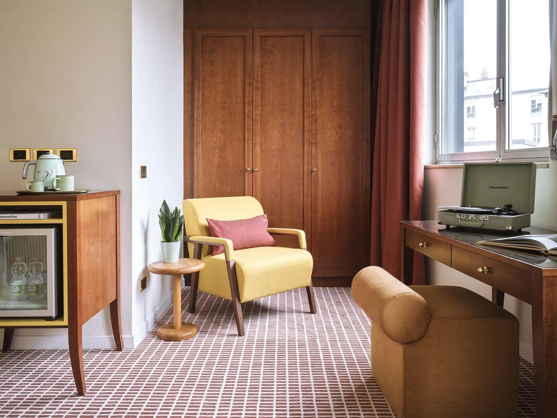 Над проектом отеля работали дизайнер Саар Зафрир (Saar Zafrir) и команда Sircle Collection. Интерьер выполнен в стиле 1970-х — в нем можно увидеть много винтажных предметов: культовые диваны Togo от Ligne Roset, классические бильярдные столы, журнальные столики, деревянная барная стойка. В комнатах эту стилистику поддерживают ретро-чайники SMEG и проигрыватели Crosley, а особую аутентичность придает отреставрированная мебель.