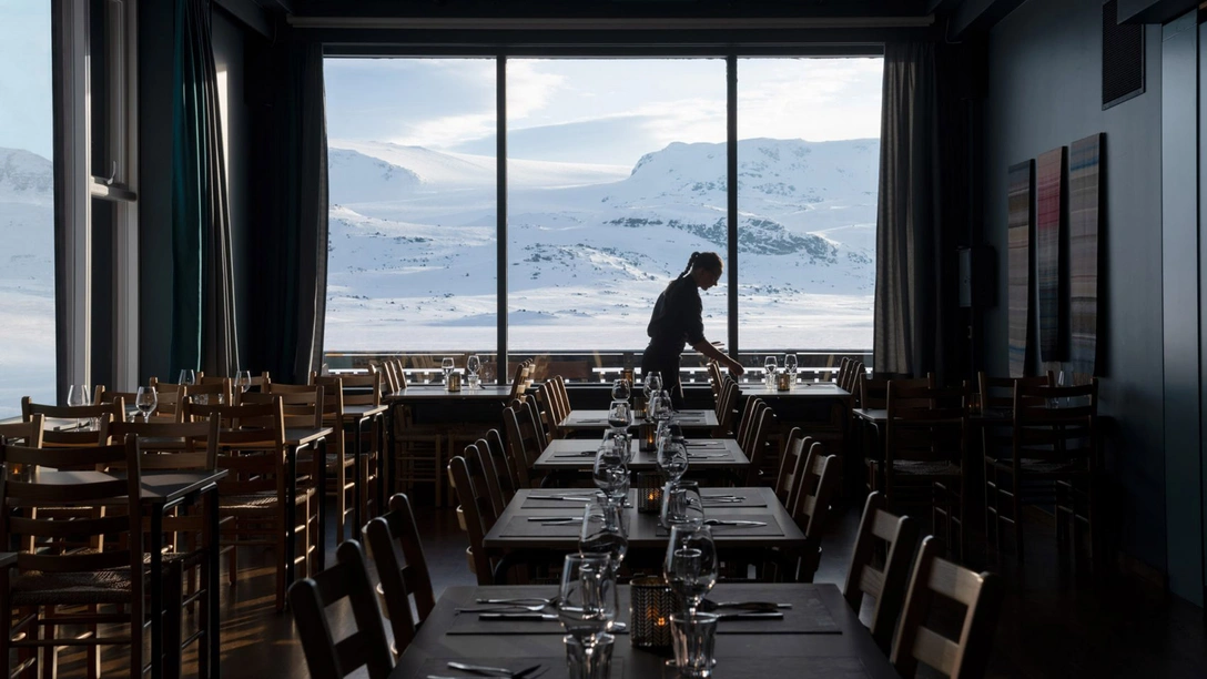 В обеденном зале авторы проекта решили сделать отсылку к прошлому отеля Finse 1222. Стены столовой оклеены обоями с цветочным принтом в духе Уильяма Морриса и украшены картинами с изображением лыжников и лыжниц 1920-х гг. А оригинальный кессонный потолок тщательно восстановлен.