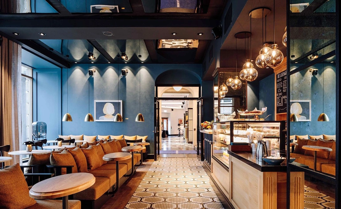 В интерьере финского архитектурного бюро Puroplan гармонично сосуществуют элементы необарочного прошлого здания — высокие сводчатые потолки, деревянные карнизы и причудливый декор — и современная палитра материалов и декора. Обитая темно-синей тканью стена за стойкой ресепшн, мрамор и латунь в лобби соседствуют с креслами Redondo по дизайну Патрисии Уркиолы (Patricia Urquiolа) и серым бархатным диваном Mr. Jones финской мануфактуры Adea. Amerikalinjen воссоздает атмосферу роскоши круизных лайнеров, пересекавших Атлантический океан в 1900-х годах.