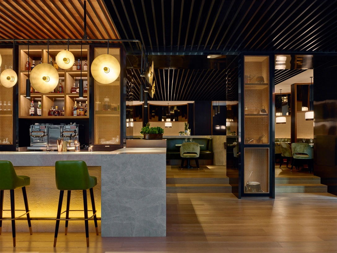 В спа-салоне дизайнеры работали над созданием мрачной, «обволакивающей» атмосферы, поэтому здесь преобладают темные оттенки. В аналогичной гамме выполнен дизайн ресторана Fu Chun Ju: глянцевые черные полы и черный же «рифленый» потолок с янтарными светильниками. Посадочные места находятся на достаточном расстоянии друг от друга и отгораживаются металлическим «ободком». www.mq-studio.com