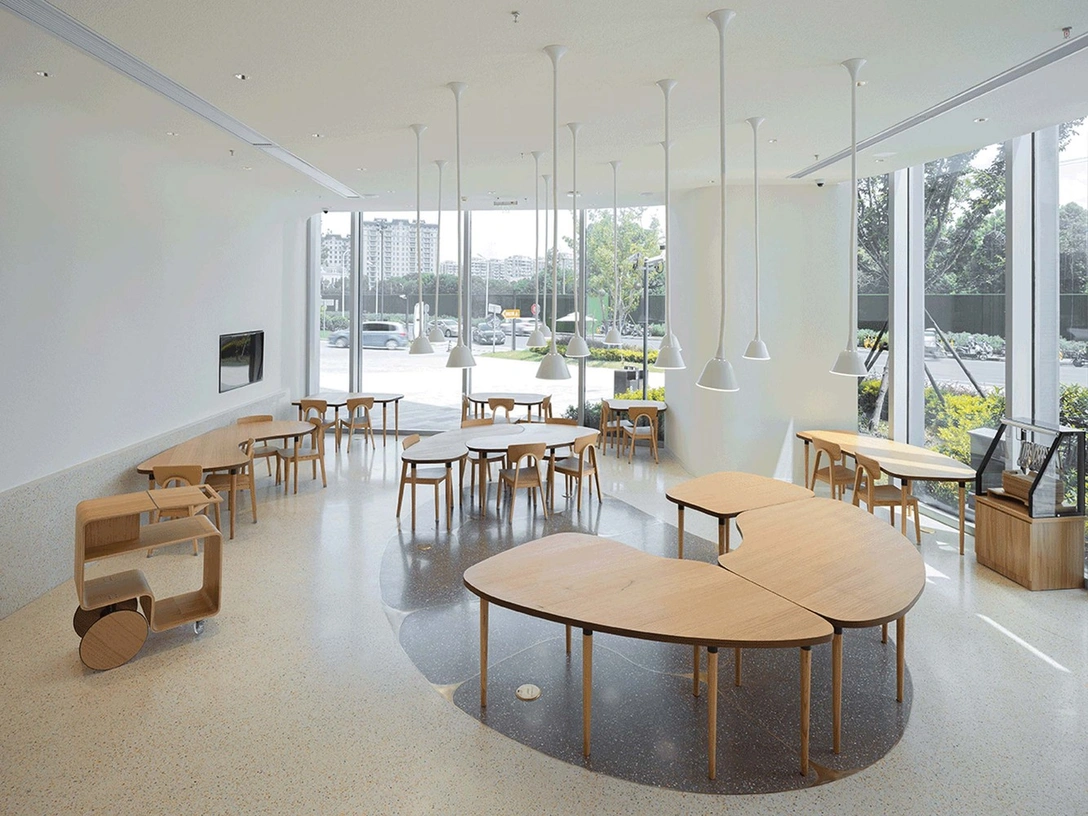 В центре пространства расположился большой стол Da Fanzhuo в форме фасоли, состоящий из десяти маленьких столиков, похожих на кусочки мозаики, которые можно разбирать и менять местами. «Вместе с владельцами 21cake мы заметили, что потребности посетителей меняются в течение дня. Например, маленькие столики, рассчитанные на одного гостя, пользуются популярностью по утрам, во время завтрака. Большие столы для разных мероприятий, от для деловых переговоров до празднования для рождения, необходимы днем и вечером. Эти же столики можно использовать в качестве витрин», — объясняют дизайнеры.