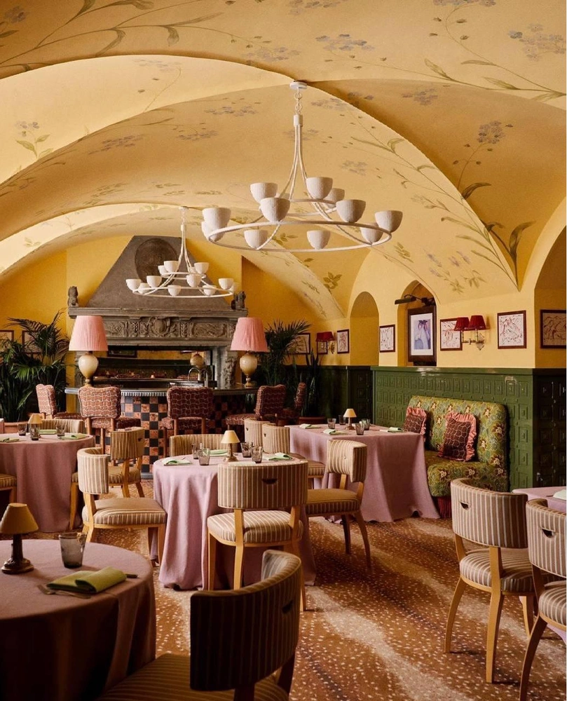 Ресторан находится в историческом здании начала ХХ века — с роскошными высокими сводами и арками. Автор проекта — лондонский дизайнер Люк Эдвард Холл (Luke Edward Hall) — не тронул исходную архитектуру и бережно наполнил ее новыми, современными деталями. Какие-то элементы были отреставрированы, как, например, массивный каминный портал. А сводчатый потолок украсили нежные полевые цветы кисти британской художницы Тимны Вуллард (Timna Woollard), растущие в швейцарском регионе Энгадин.
