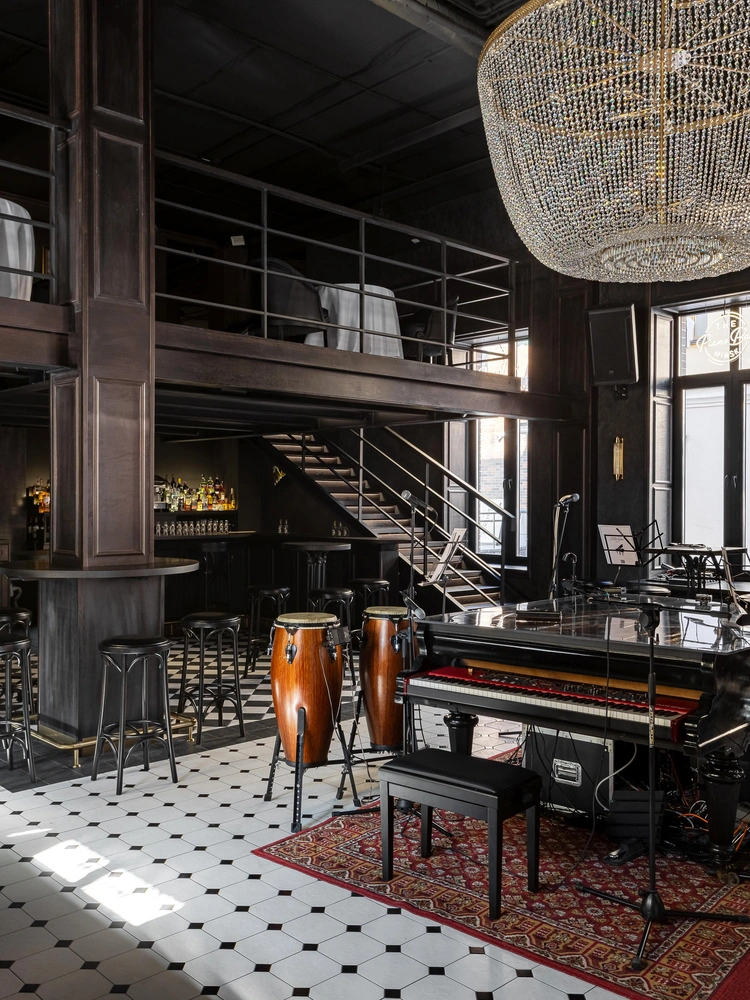 Piano Bar — бар с довольно необычной концепцией. Оркестр здесь выступает прямо рядом со зрителями — в такой обстановке посетители становятся непосредственными участниками концерта. Авторы проекта — дизайнеры Анна Александрова и Анна Винникова-Сыцевич взяли за отправную точку атмосферу традиционных английских гостиных. Так в интерьерах появилась черно-белая шахматная плитка на полу, молдинги на стенах, деревянные откосы, дубовая мебель, хрустальные люстры и детали из латуни.
