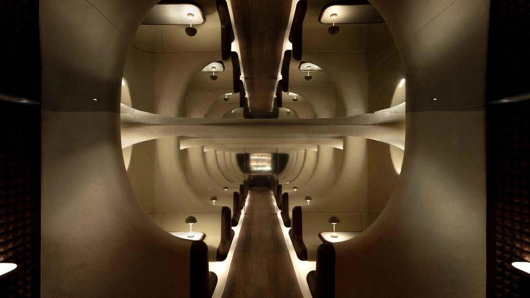 В главном баре архитекторы NCDA использовали стекловолокно для создания гнутых органических форм. Здесь есть и изогнутые арки, и скульптурные элементы в виде ребер, напоминающие конструкции подземных цистерн.