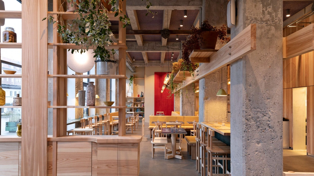 Интерьер, разработанный студией Spacon & X, вдохновлен обликом традиционных японских баров идзаякая. Чтобы создать комфортную и непринужденную обстановку, дизайнеры использовали теплые оттенки и материалы, которые контрастируют с несущими конструкциями из бетона. Кроме того, они добавили деревянный «мостик» над столами, который обвивают комнатные растения.