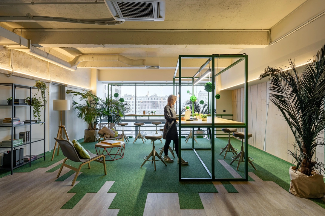 Основное внимание было уделено проектированию рабочих станций, изготовленных под заказ. Разработанная дизайнерами мебель позволяет работать сидя и стоя, вести переговоры или сидеть за ноутбуком за общим столом. Рабочие станции зеленого цвета дополняют светильники и декор из мха, не требующий ухода. Мягкая безопасная среда в зеленой и желтой палитре располагает к общению и работе в приятной обстановке.