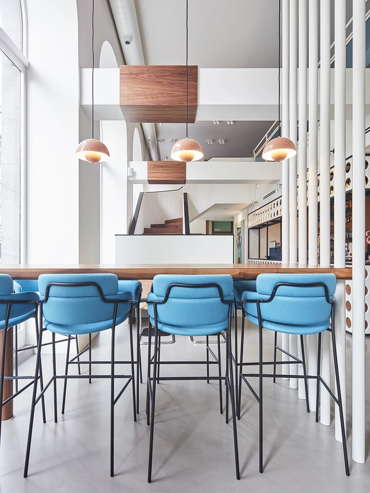 Интерьер же, по словам архитектора Фабио Фантолино (Fabio Fantolino), должен переносить посетителей в атмосферу Западного побережья 1970-х годов. В своей работе дизайнер использует «курортную» цветовую гамму: бархат цвета глубокого синего моря, хлопок оттенка выжженной зеленой травы и замшу разнообразных песочных тонов. Фоном для дизайнерских объектов мебели и света стали деревянные панели из американского ореха и обои с голубым принтом в виде листьев папоротника.