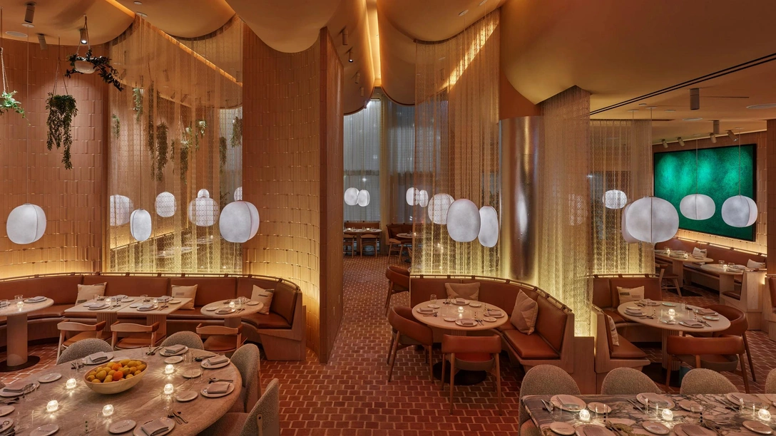 Основная зона на уровень ниже — это просторный зал на 180 посадочных мест с потолком двойной высоты. Стены здесь отделаны терракотовой плиткой, а с потолка свисают необычные светильники в форме фонарей. Здесь команда Rockwell Group постаралась воссоздать атмосферу традиционного испанского патио. Терракотовая плитка на полу, светильники-фонари, живые растения и оливковые деревья в кадках — все это создает ощущение трапезы на свежем воздухе в далекой Андалусии.