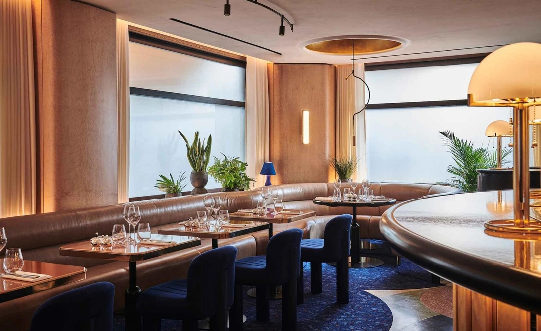 Цветовая палитра интерьера — ода живописному побережью Ривьеры. Гости могут расположиться на изогнутой кожаной банкетке вдоль стены или бархатном кресле цвета индиго. Светящиеся зеркальные панели визуально делают пространство ресторана больше и создают почти сюрреалистичный эффект бесконечности. Пол украшает уникальный рисунок терраццо, на создание которого ушло больше месяца, и столь же тщательно продуманный ковер с цветочным узором, разработанным Codimat.
