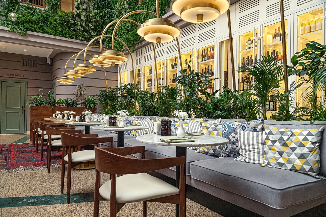 Интерьеры оформлены в современном стиле — с удобной мягкой мебелью, обилием зелени и ненавязчивыми отсылками к Грузии. «У нас ресторан современный грузинской кухни и мы хотели передать это в интерьере, — рассказывает ресторатор Гаджи Зулумханов. — Я называю это дизайном грузинского ресторана без пластикового винограда. Мы пытались сделать современное пространство, где Грузия прослеживается в виде легких, но ярких акцентов, постарались сохранить грузинский дух гостеприимства, уюта, грузинских двориков и улочек.