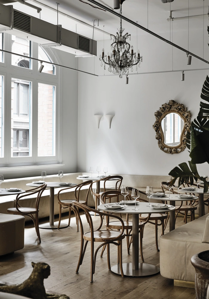 Окна без штор и жалюзи и голые стены помогают акцентировать красоту естественного освещения, в то время как латунные бра и изящные люстры добавляют декадентские штрихи в атмосферу ресторана.