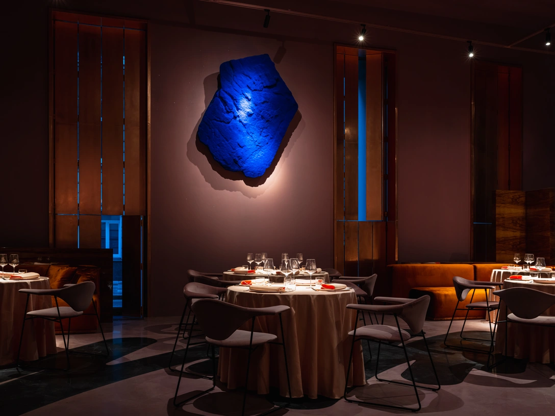 «Над барной стойкой парит сказочная люстра, сделанная по индивидуальному заказу французской художницей из тысяч осколков стекла и зеркал, словно светящийся глаз, отражающий и подсвечивающий ваши чувства и впечатления. А театральный полог из розового бетона зовет вас в мир, где в великолепном представлении соединяются вкус и идеально дополнивший его визуальный ряд». NB Studio, www.nb-studio.ru