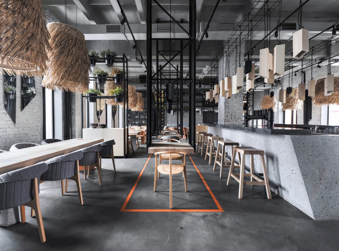 Планировку решено было сохранить открытой, чтобы максимально наполнить пространство естественным светом. Центром зала стали две симметричные барные стойки, выполненные из бетона с наполнением кремнем — символом твердости и стойкости характера. Весь интерьер строится вокруг нейтральной приглушенной гаммы из оттенков серого с вкраплениями теплых бежевых тонов.