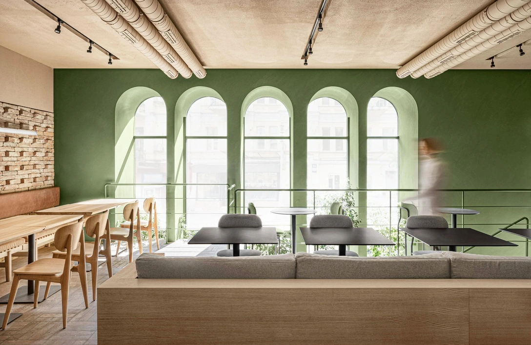 Первый этаж — наиболее динамичное и функциональное пространство, предназначенное для активного потока гостей, быстрых ланчей, перекусов и бизнес встреч. Главный архитектурный элемент этого зала — высокие арочные окна, выходящие на Прорезную улицу. Архитекторы сохранили оригинальные старинные откосы и покрасили их в светлый зеленый цвет — цвет свежей листвы и живой зелени. Он отлично сочетается с фактурными стенами из кирпича и лаконичной мебелью. На полу также частично использован кирпич — как настил в патио или в саду.