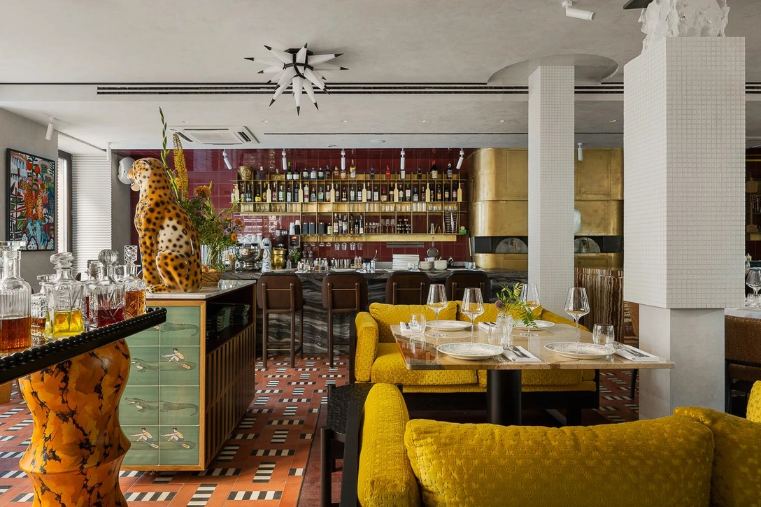 Попытки понять, в каком времени существует это пространство, тщетны. Терракотовые полы, стойка бара из мрамора и оникса — отделка и цветовая гамма мебели как будто намекают на то, что мы находимся в итальянском палаццо прошлого века. Но наверняка сказать сложно — много здесь и современного. Например, вмонтированная в мебельные фасады плитка Reda с ироничными сюжетами — коллаборация с художницей Дарьей Васильковой. Акриловое панно с ярким оранжевым пятном авторства Яна Тихоненко. Картина с гепардами, а-ля примитивизм, от Максима Винокурова. Она рифмуется с керамическим гепардом — винтажной напольной статуей, какие когда-то были в моде и встречались в респектабельных гостиных.