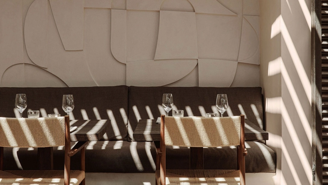 В интерьере дизайнеры Lambs & Lions использовали приглушенную палитру серых, бежевых цветов и темное дерево. Большое количество тропических растений и кактусов заставляют нас вспомнить о Бали или о Карибских странах. В пространствах Nōema есть также множество контрастных фактур: необработанный бетон, полированный цемент, фактурная плитка. Они добавляют интерьеру ресторана целостности. В меню Nōema преимущественно рыбные и вегетарианские блюда. За кухню отвечает шеф-повар Атинагорас Костакос, работающий в ресторанной индустрии Миконоса более 20 лет.