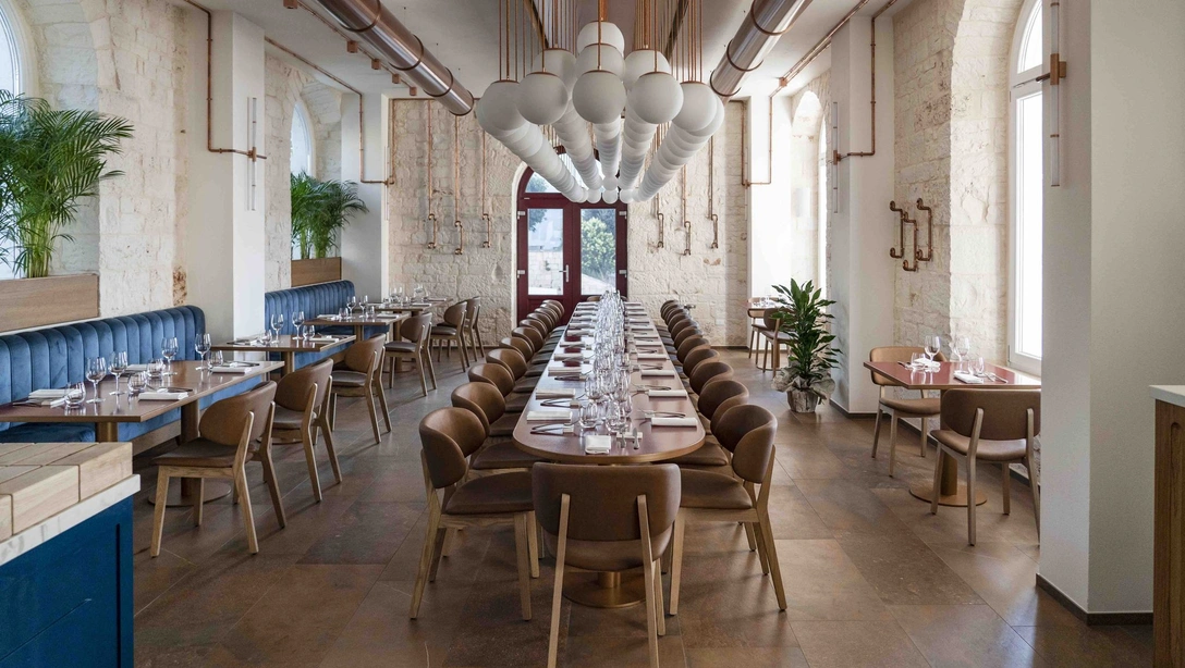 Проект местного архитектора Франческо Консоли (Francesco Consoli) начался с восстановительных работ: в здании, где сейчас находится ресторан, раньше размещалась электростанция, впоследствии заброшенная и разрушенная. Высокие арочные проходы, колонны и каменная кладка до сих пор придают пространству особое очарование.