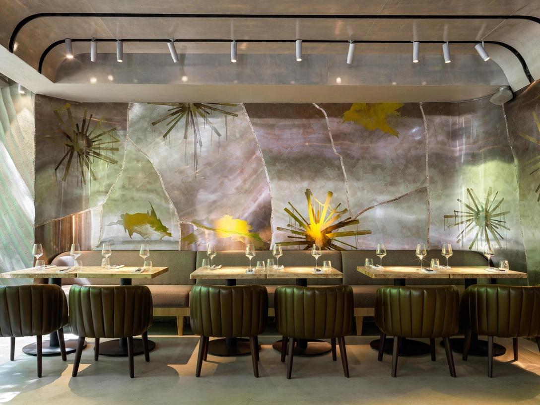 Путешествие начинается, как только гость переступает порог ресторана и попадает в интерьер, созданный Ириной Глик и бюро «Геометрия». Плавные изгибы лакированного кленового потолка — как оммаж вагонам Восточного экспресса, в котором европейцы сто лет назад мчались навстречу загадочному и манящему Востоку. На этом пути их ждало множество приключений, о которых мы знаем благодаря романам Агаты Кристи, которая несколько раз путешествовала этим респектабельным поездом (и даже посвятила ему одно из своих самых известных произведений). Кстати, экзотические блюда были частью маршрута. В каждой стране, которую пересекал Восточный экспресс, пассажирам предлагали блюда национальной кухни.