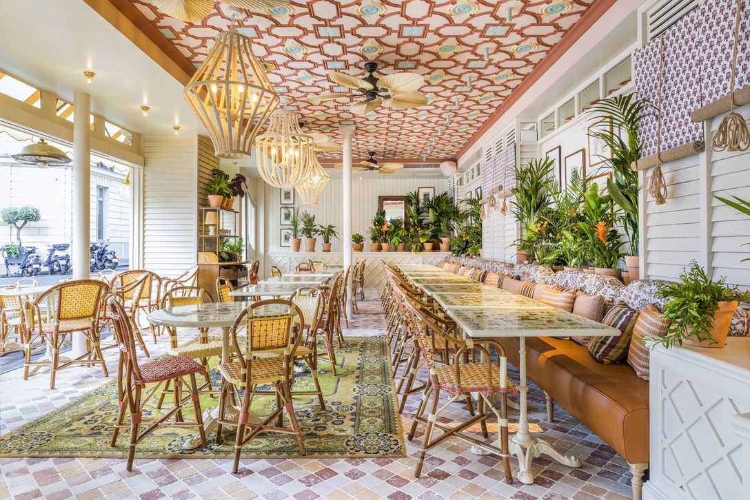 Создавая интерьер, Лаура стремилась сохранить дух традиционного английского паба, придав ему индийский оттенок. Зал, переходящий в открытую террасу, с красочным потолком в колониальном стиле, и диванами, обитыми светло-коричневой кожей, выглядит как роскошная декорация к болливудскому фильму. Цветочные орнаменты на столах, выполненных итальянским мастером по эскизам Гонсалес, сочетаются с зелеными растениями и апельсиновыми деревьями.