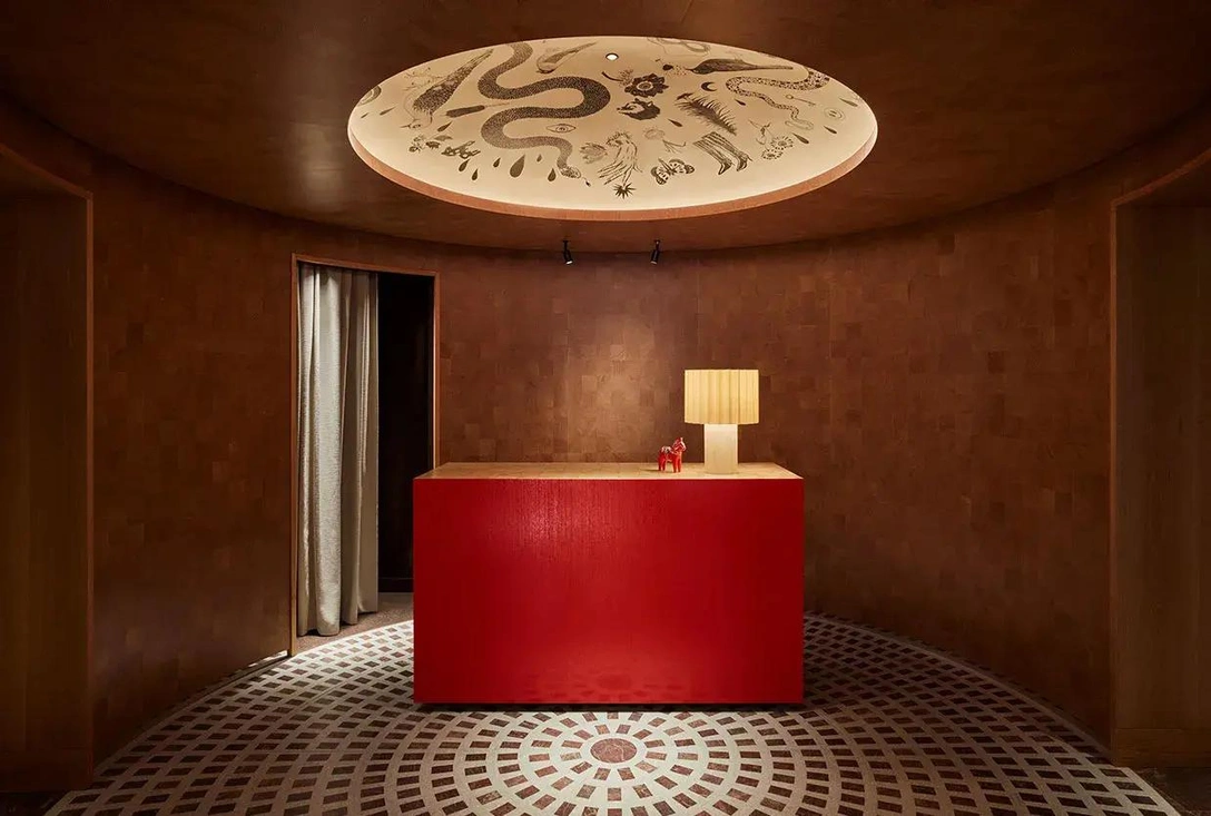 Дизайн входной зоны навеян лесными часовнями и скандинавскими церквями. Круглое пространство облицовано деревом с выраженной текстурой. В центре стоит ярко-красная стойка ресепшен, а над ней находится купол с подсветкой, украшенный рисунками художника Рагнара Перссона (Ragnar Persson).