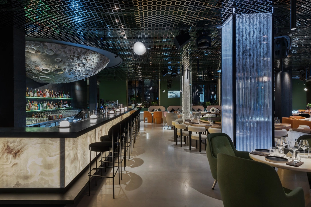 Центром притяжения гостей стал бар, над которым нависает четырехметровая Луна, напечатанная на 3D принтере. Сама стойка выполнена из горячекатаного металла и оборудована подогревом.