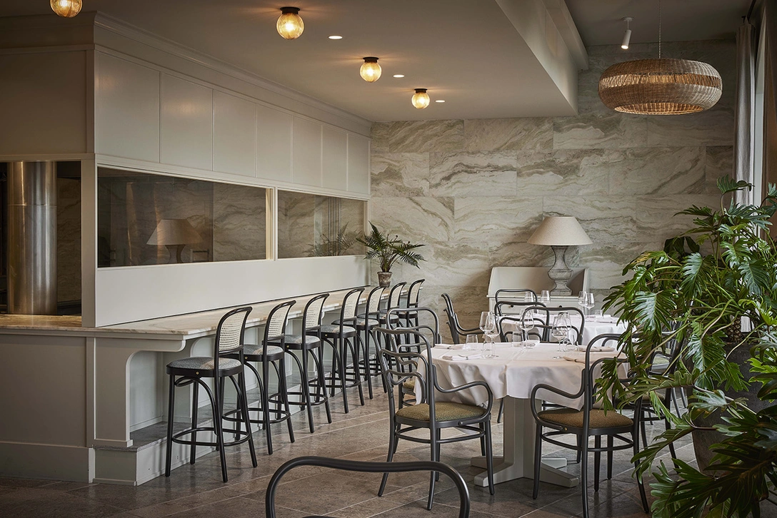 Основной зал выдержан в нейтральных серо-оливковых тонах и буквально утопает в пышной зелени растений. Столы окружают кресла Loafer Chair, разработанные студией Space Copenhagen, и классические стулья Vienna 144 от Gebrüder Thonet. Больше всего внимания к себе притягивает винтажный итальянский буфет, который служит станцией для официантов. Обстановку светильники в легких плетеных абажурах, привносящие в интерьер ноту средиземноморского стиля. В ресторане также есть большой внутренний двор с обеденной зоной на открытом воздухе, организованный вокруг U-образных скамеек из твердых пород дерева.