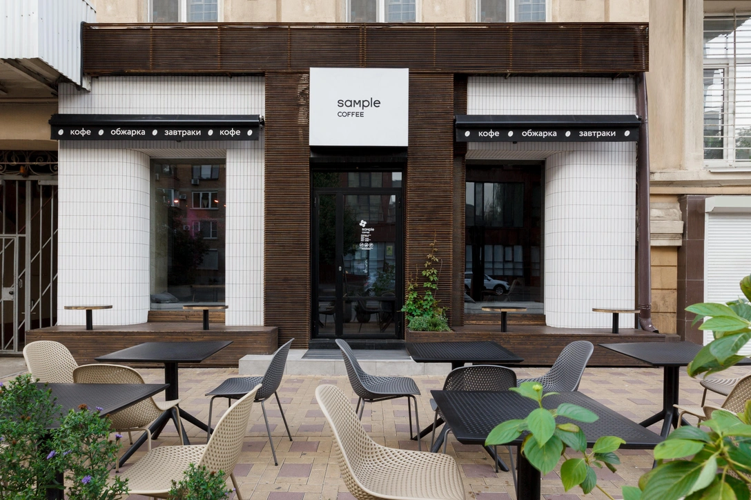 Ощущение дома дизайнеры передали через насыщенный кофейный цвет, мягкий текстиль и домашний декор. Справа от входа — барная стойка с акцентной белой плиткой, которую окружают комфортные диваны и кресла, открытые стеллажи, книги и фоторамки. Зона рассадки компактна, но комфортна и не ощущается тесной.