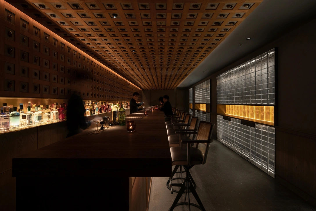 Потолок и стена за стойкой оформлены деревянными панелями с ячейками, в каждой из которых находится жук — всего их 1254. Напротив бара расположилась стена из стеклоблоков, по центру которой тянется линия подсвеченных фрагментов с тайскими черными птицеедами внутри.