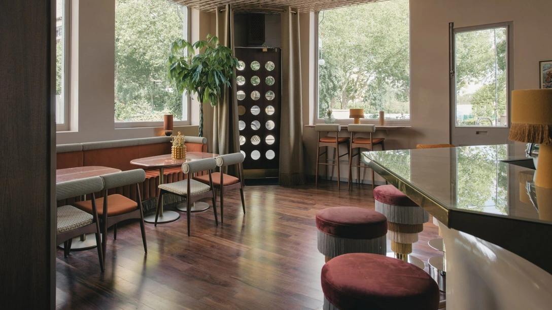 На первом этаже находится ресторан Cha Cha's, в котором подают поздние завтраки и блюда латиноамериканской кухни. На фоне персиковых стен выделяется огромной шестиугольной барной стойкой с латунными краями. Она окружена яркими табуретами от Masquespacio с лиловой, кремовой и бежевой окантовкой.