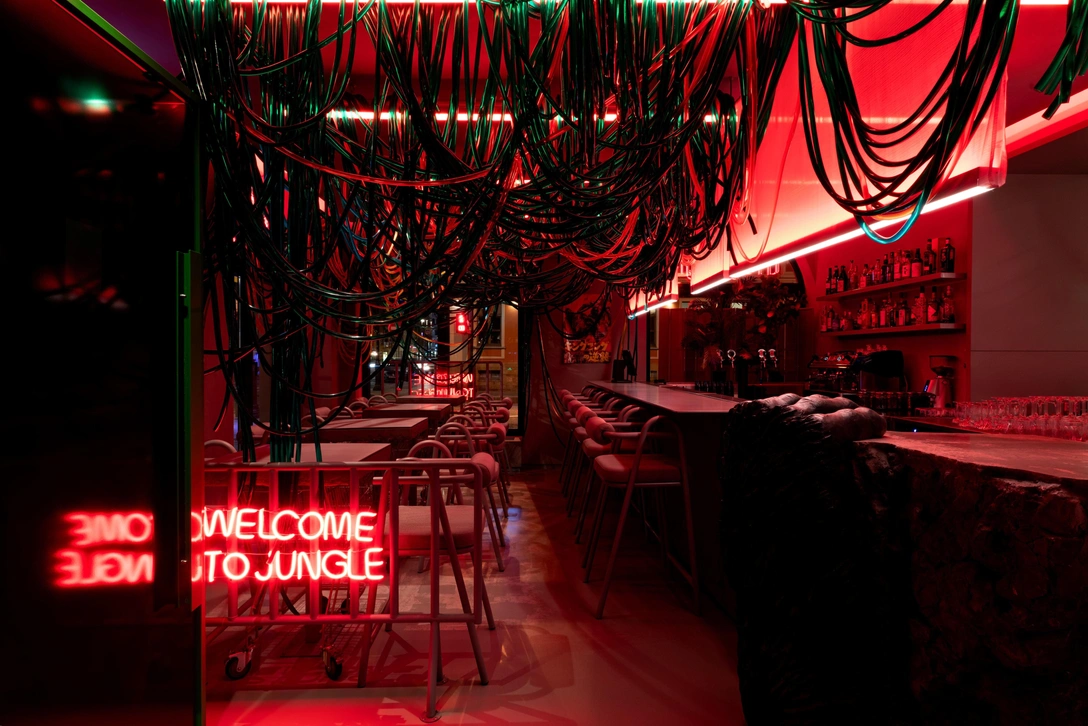 По мере продвижения от входа пространство становится темнее и превращается в «нуарные диджитал джунгли». Среди бетонных стен и лиан проводов, свисающих с потолка, можно увидеть неоновые вывески, постеры, посвященные манге, игровые автоматы и другие детали, отсылающие к азиатской культуре. И здесь же появляется брутальный осколок скалы — бар, который «держат» огромные лапы гориллы.