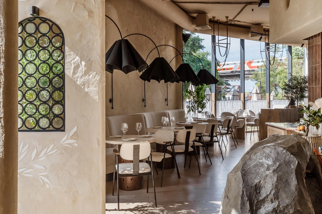 У выхода на открытую террасу пол выполнен из колотого природного камня кирпичного оттенка. Это сделано для того, чтобы экстерьер плавно перетекал в интерьер, поэтому внутри ресторана много зелени и деревьев в кашпо, а благодаря панорамному остеклению стерается грань между улицей и помещением.