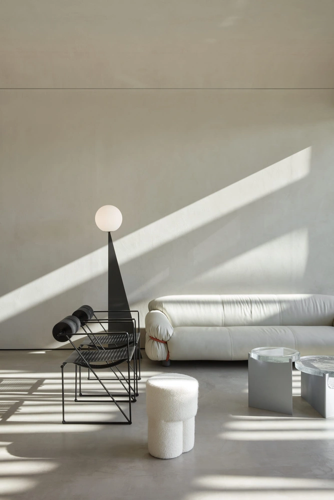 Проникающие в пространство солнечные лучи создают сложные тени на оштукатуренных стенах. Получившуюся атмосферу загадочности усиливает тонкая светодиодная подсветка, подчеркивая изящную арочную форму потолка и придавая ему еле заметный блеск. Весь потолок усеян точечными светильниками, напоминающими звезды, а стены украшают бра, выполненные из полированного алюминия.