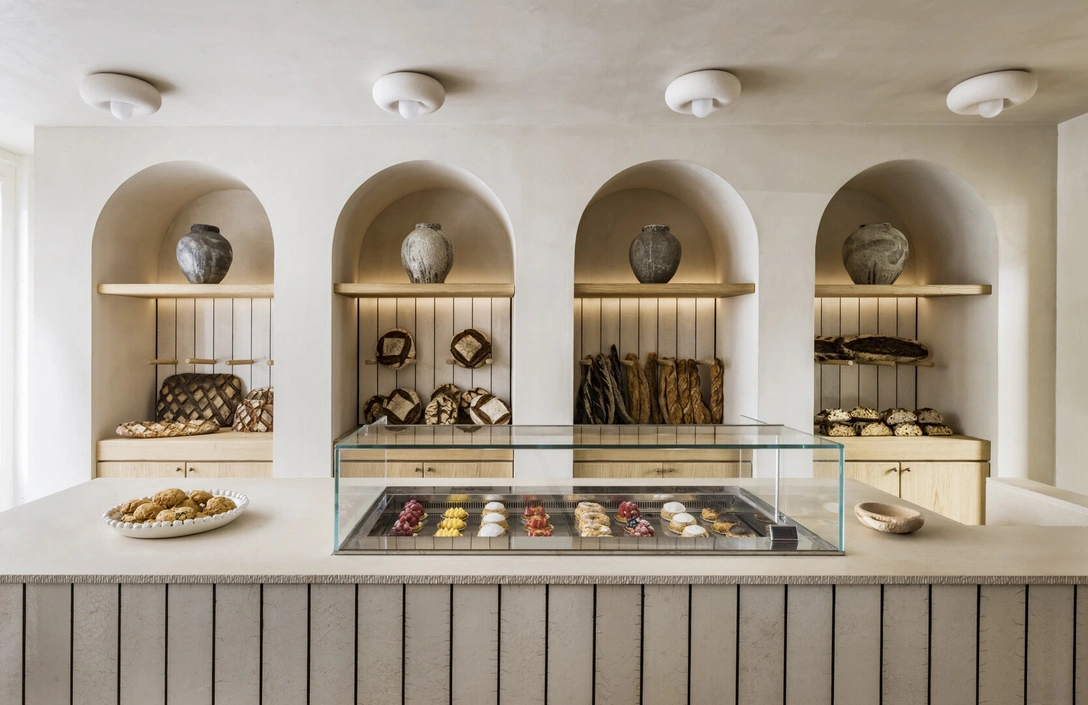 Интерьер заведения строится на сочетании бежевых оттенков и округлых форм. От самого входа вдоль стены тянется стройный ряд арок, в которые встроены полки и столики для гостей. Сводчатые ниши, расположившиеся за прилавком, используются как витрины для выпечки. Сама стойка облицована белой керамической плиткой, обработанной с помощью традиционной японской техники обжига. Под воздействием высокой температуры поверхность плитки покрывается мелкими трещинами, и, по мнению Эммануэль, становится похожей на свежий хлеб, который только что достали из печи.